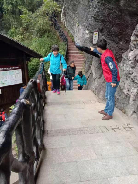 “您好”“請”“謝謝”“您辛苦了”這些看似簡單的文明用語,時常在游客朋友耳邊響起。一位腿腳不方便的游客朋友想過馬路到游客服務中心,但是地下通道要經過樓梯,志愿者趕緊主動上前指引游客,親手推著游客通過特殊人群通道過馬路。